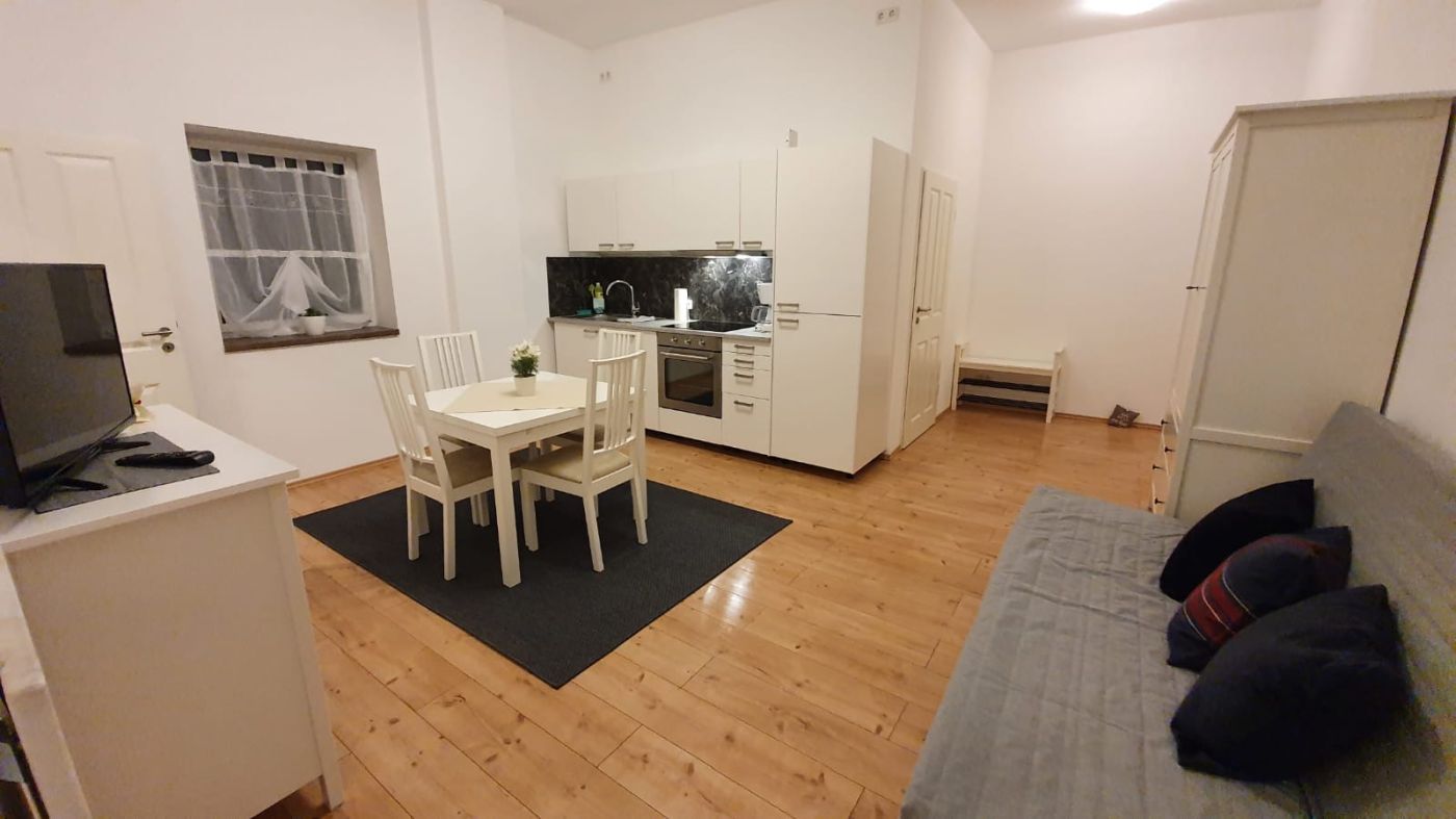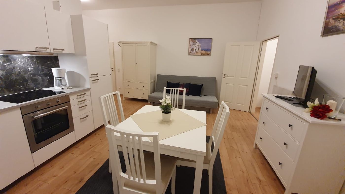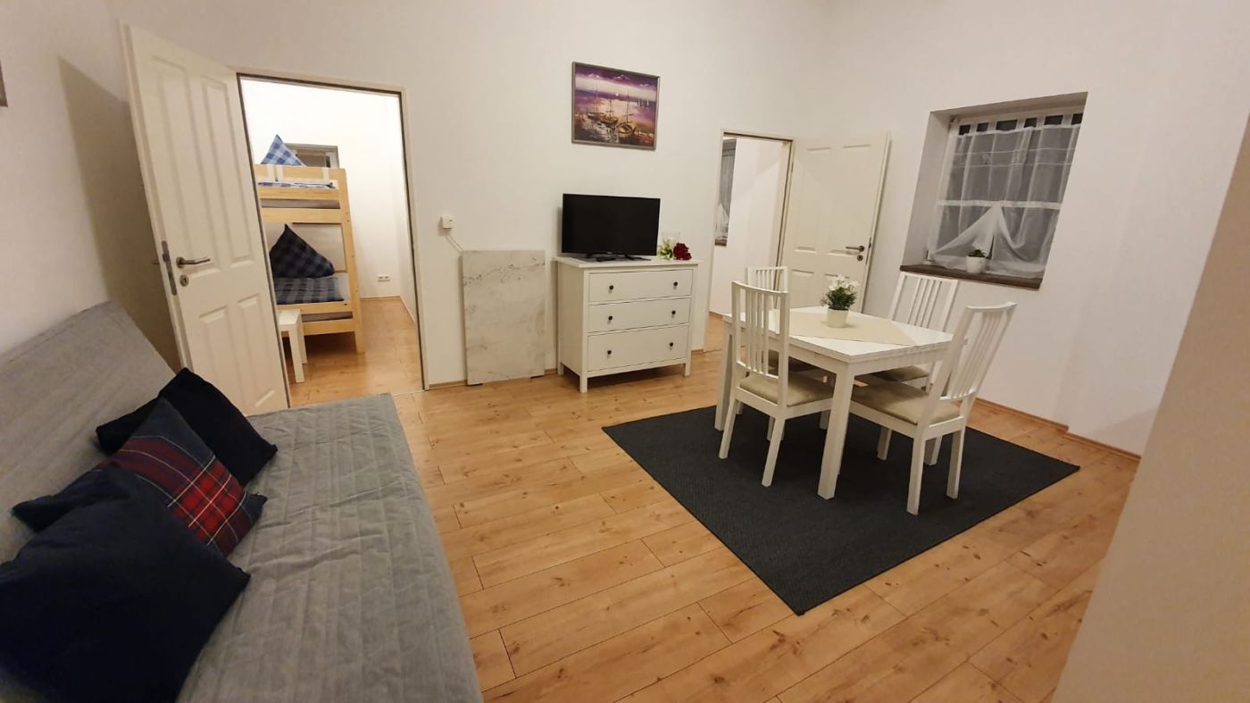 Dieses Apartment (53 m²) verfügt über ein Wohnzimmer, zwei separate Schlafzimmer und ein Bad mit Dusche und Haartrockner. Die gut ausgestattete Küche umfasst einen Herd, Kühlschrank, Geschirrspüler und Küchenutensilien. Es bietet schallisolierte Wände, eine Kaffeemaschine, eine Sitzecke, einen Flachbild-TV mit Satellitenkanälen sowie Blick auf den Innenhof. Es gibt drei Betten. Das Bad mit Dusche befindet sich in der abgeschlossenen Wohnung.